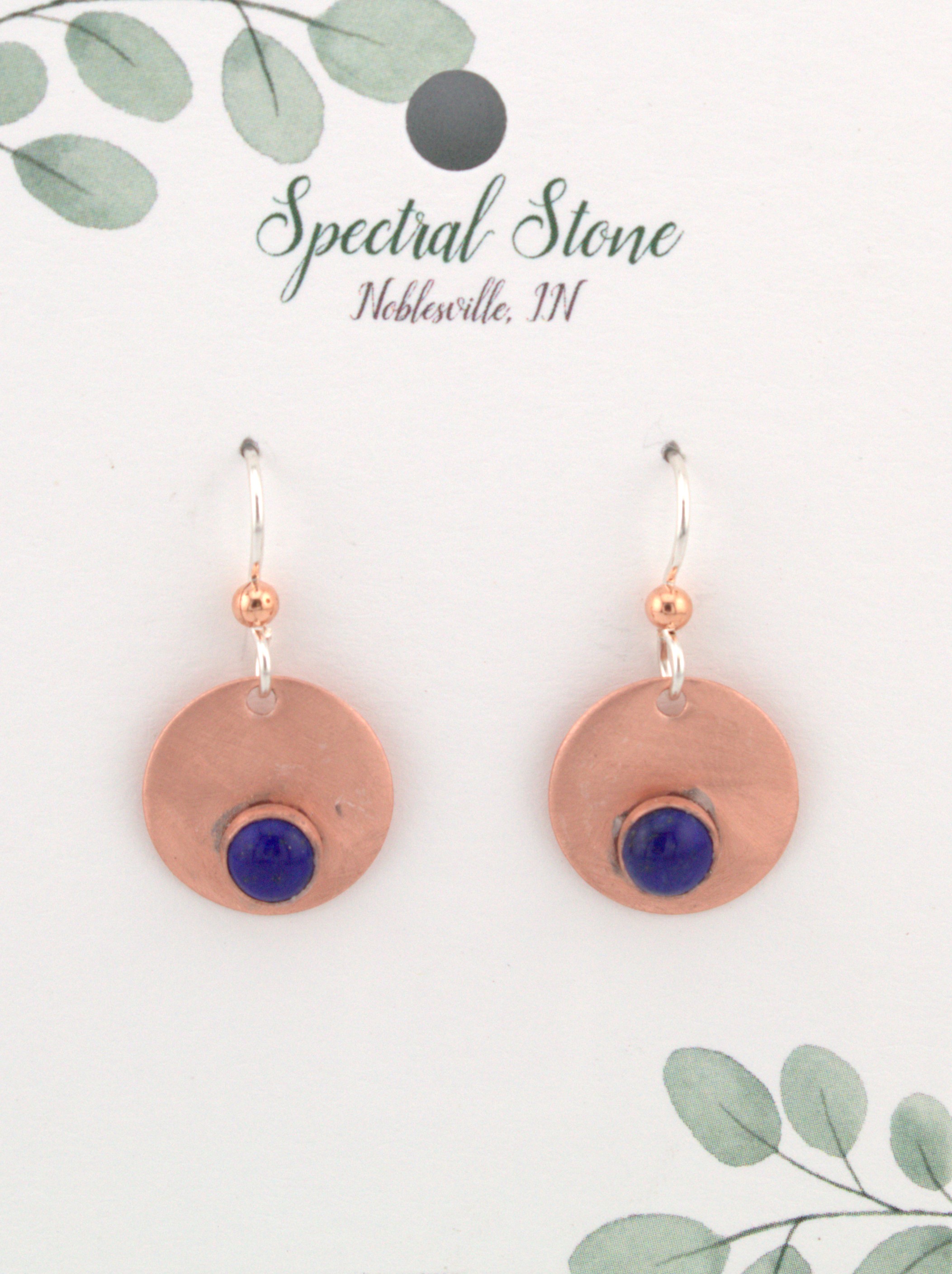 Stylish copper earrings with lapis lazuli on Sterling Silver ear wire.